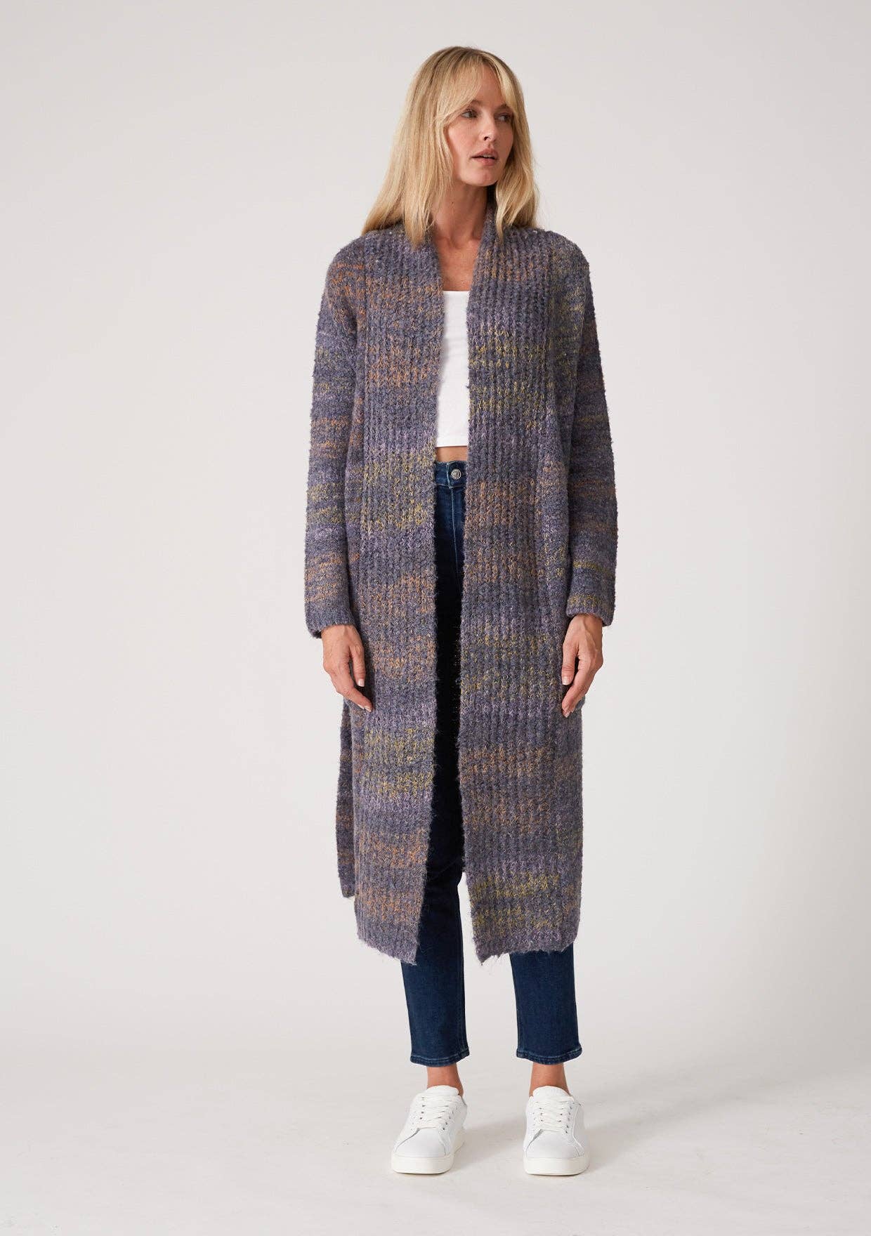 Marled knit cardigan with a shawl collar, long sleeves, and large patch pockets. The perfect boucle, fuzzy cardigan to add to any Fall wardrobe.