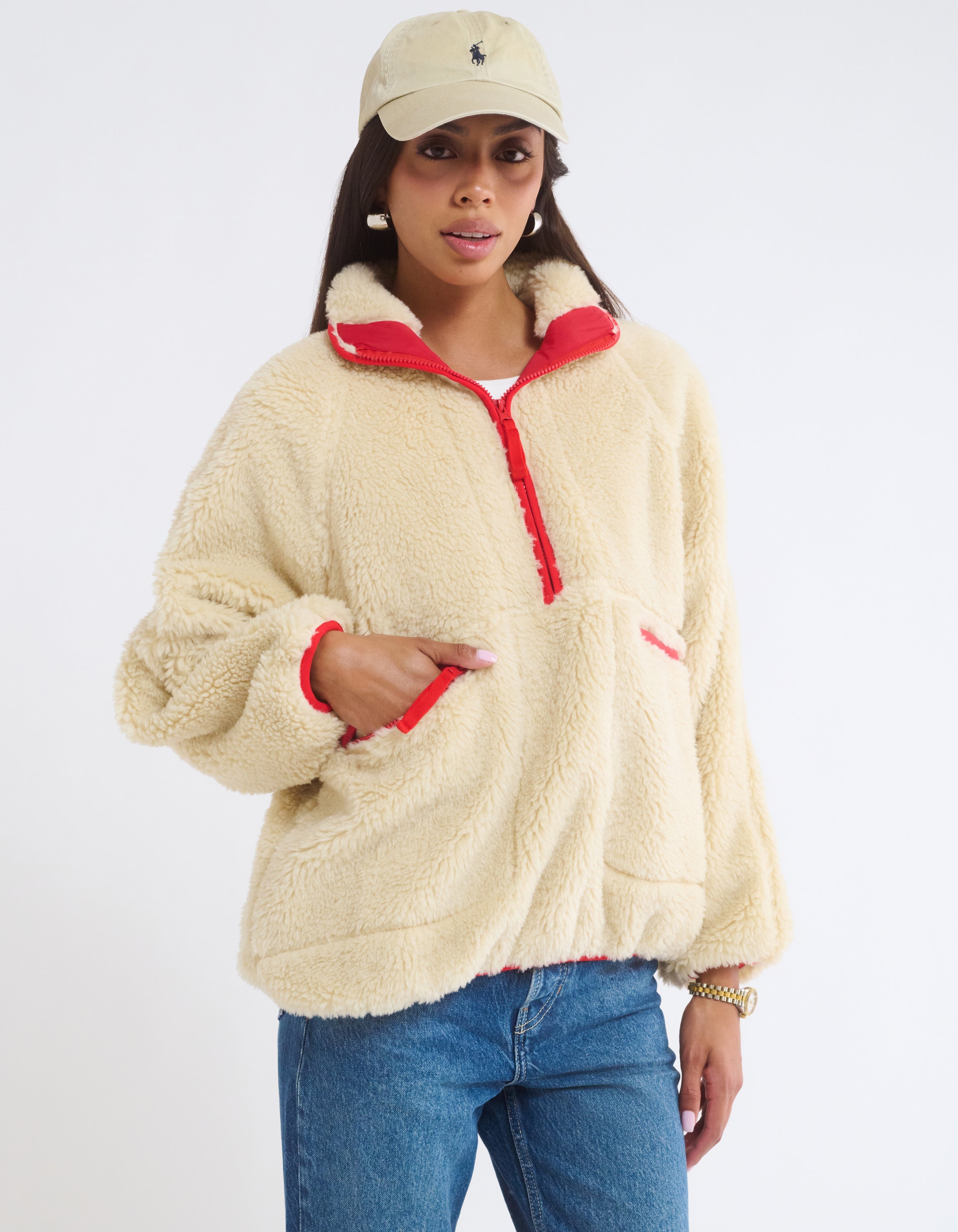 Temperatures are dropping — cue our ultra warm sherpa fleece jacket with large front pockets and a half zip design. Throw it on during hikes, dinner, long plane rides—anytime, anywhere