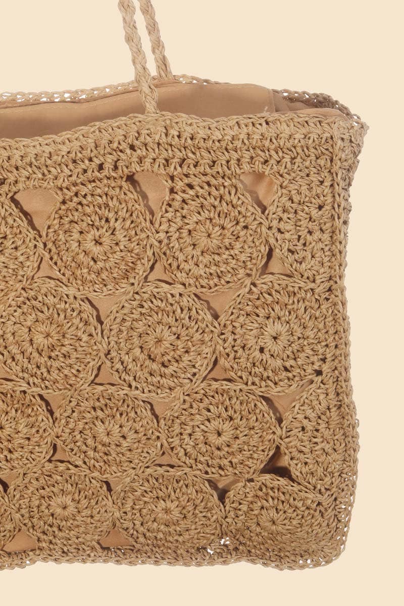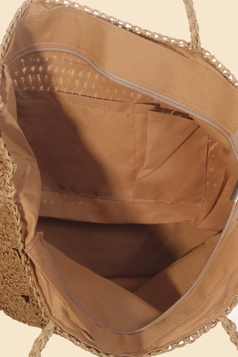 Woven from natural raffia with a charming circular braid design, this tote is your go-to companion for farmers markets, beach days, or casual errands. The spacious interior keeps everything organized, while the sturdy handles make carrying a breeze. Perfect for anyone who loves a touch of texture and timeless style without taking themselves too seriously. A playful essential that works as hard as you do.
