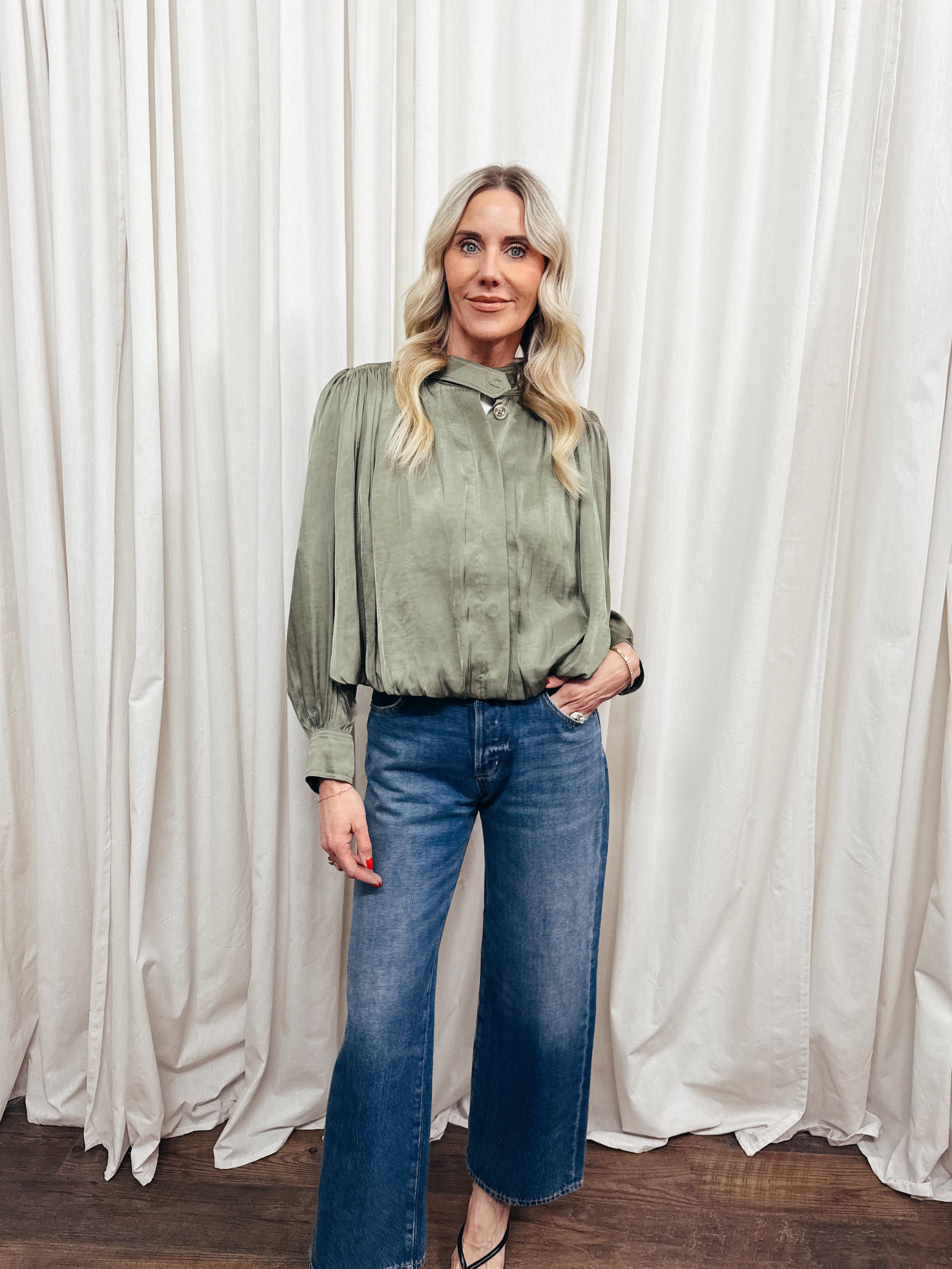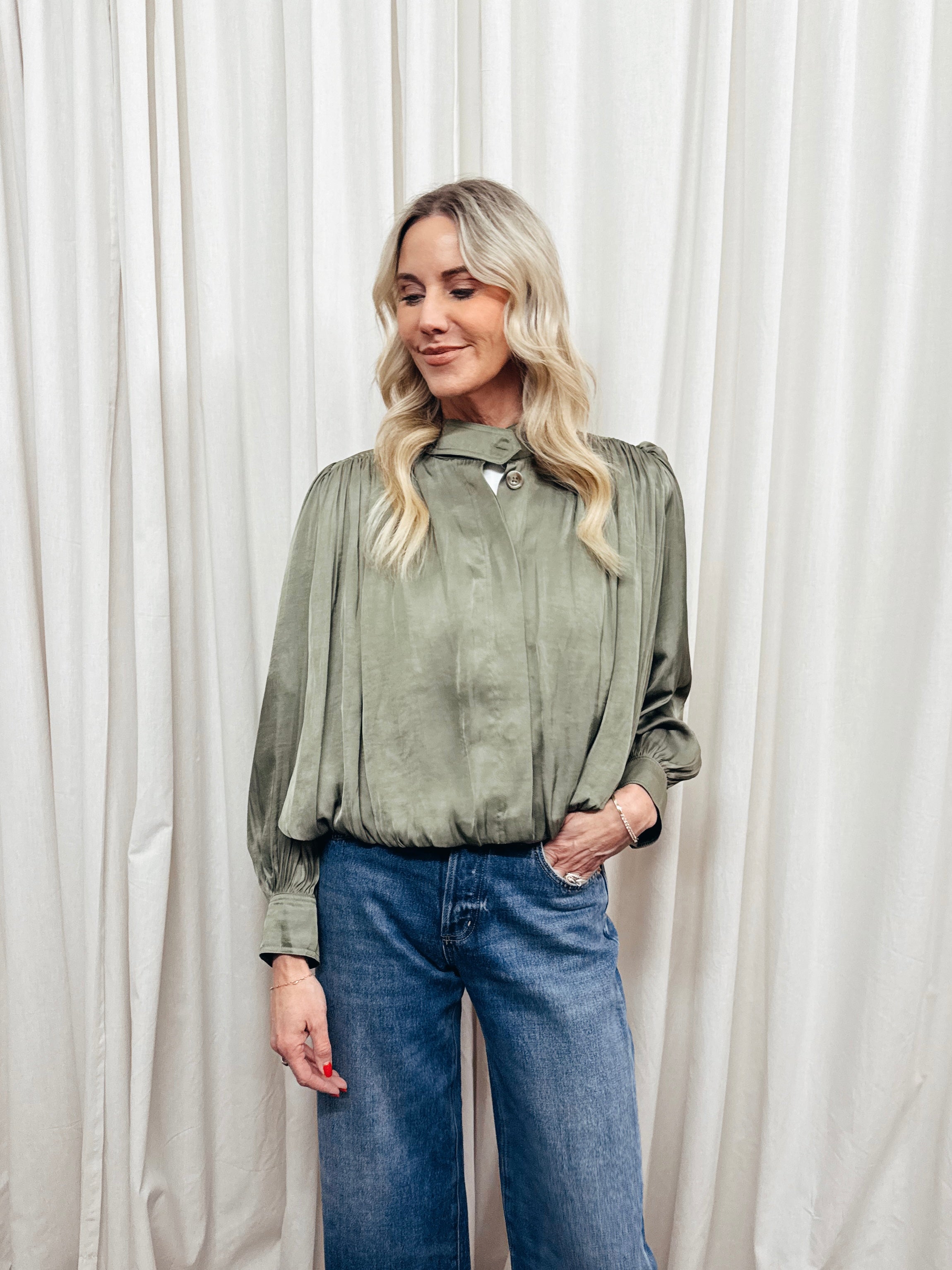Elevate your wardrobe with the High Neck Pleat Detail Jacket, designed in a rich olive green tone for a sophisticated touch. Featuring a relaxed fit with delicate pleating throughout, this blouse offers effortless elegance with its high neckline and statement button details. The long, slightly puffed sleeves with buttoned cuffs add a feminine finish, making it perfect for both casual and polished looks.