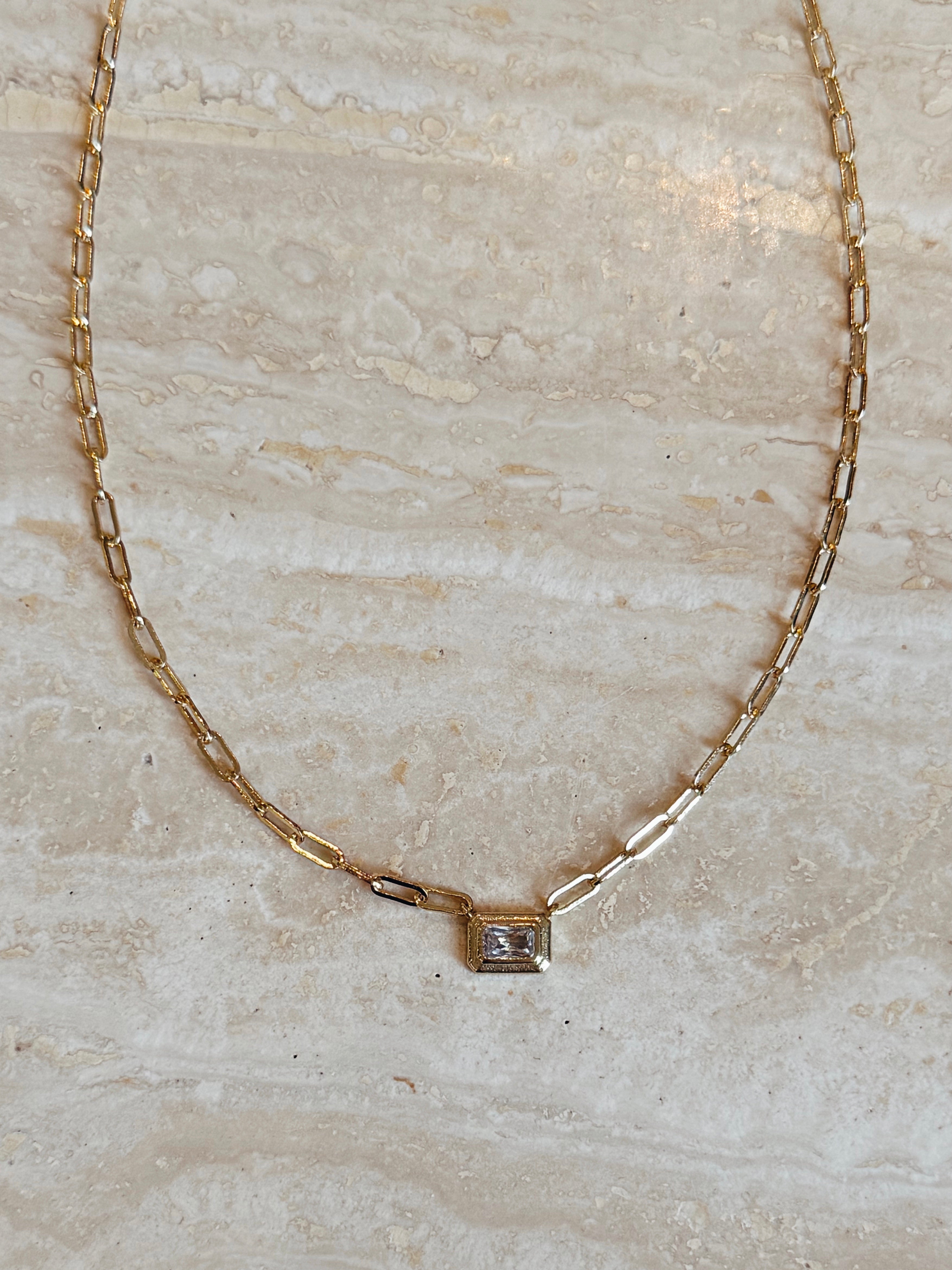 Sleek, modern, and always stylish, this necklace carries a charming gold dipped cubic zirconia baguette pendant design. Transform your outfit into a fashion masterpiece with this versatile necklace, an essential for the style-conscious individual.