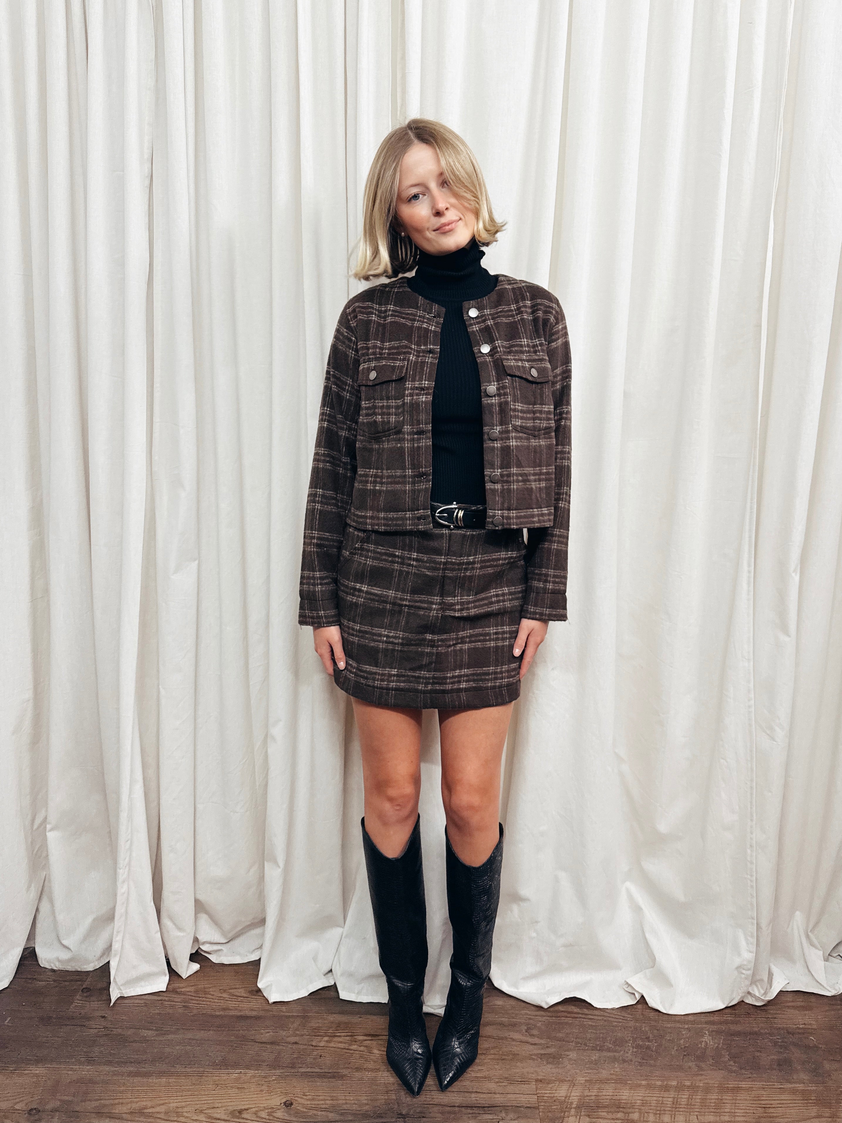 The Brushed Plaid Collarless Jacket effortlessly bridges casual and refined style. Its soft brushed fabric drapes with understated elegance, while the classic plaid pattern adds visual interest without demanding attention. The collarless design creates a streamlined silhouette that works beautifully layered or worn alone. Perfect for those who appreciate timeless pieces that transition seamlessly from day to evening, this jacket brings quiet sophistication to any wardrobe.
