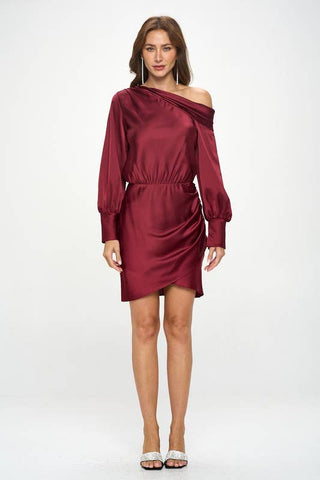 The Satin Off Shoulder Ruched Asymmetrical Dress