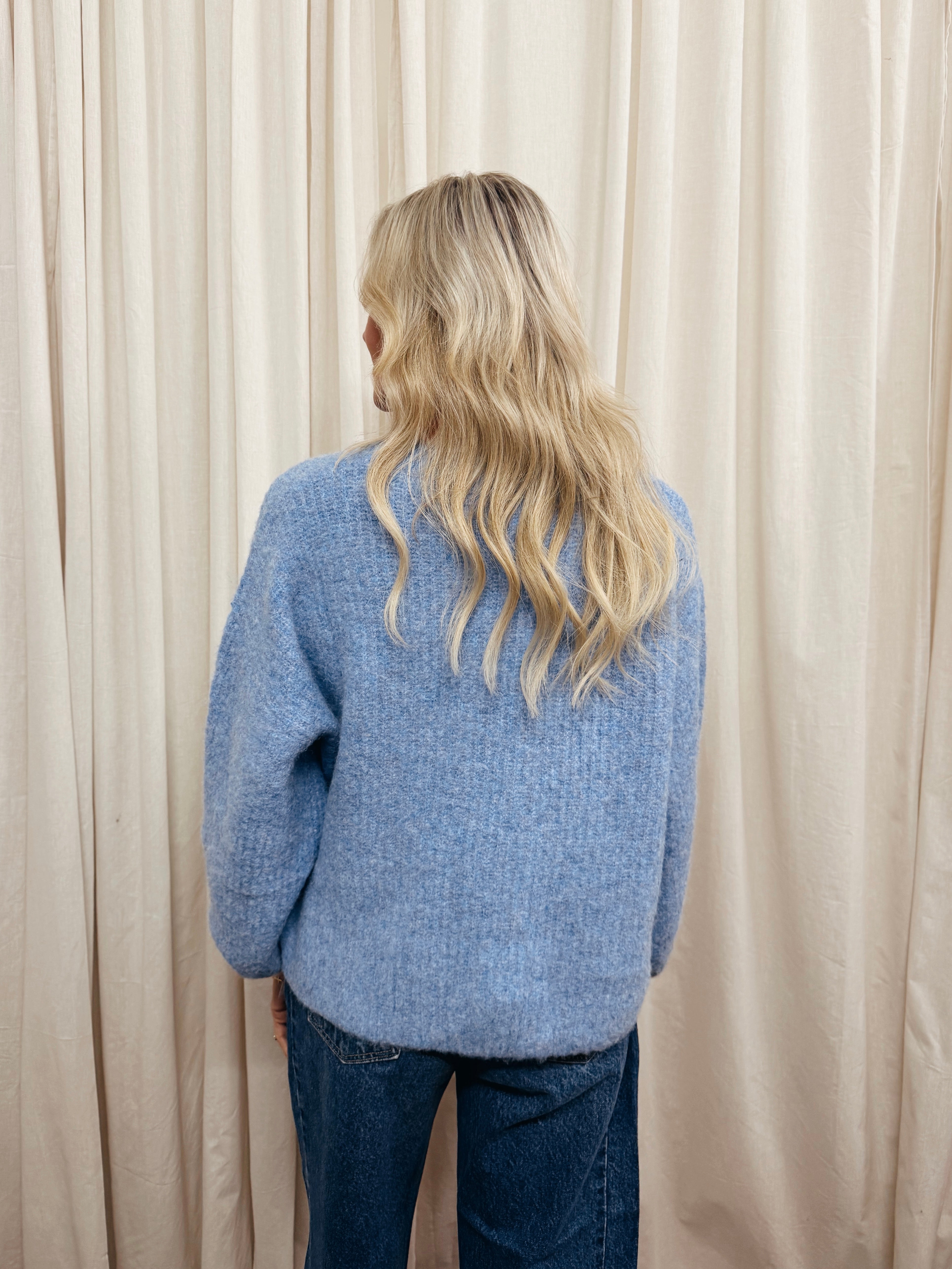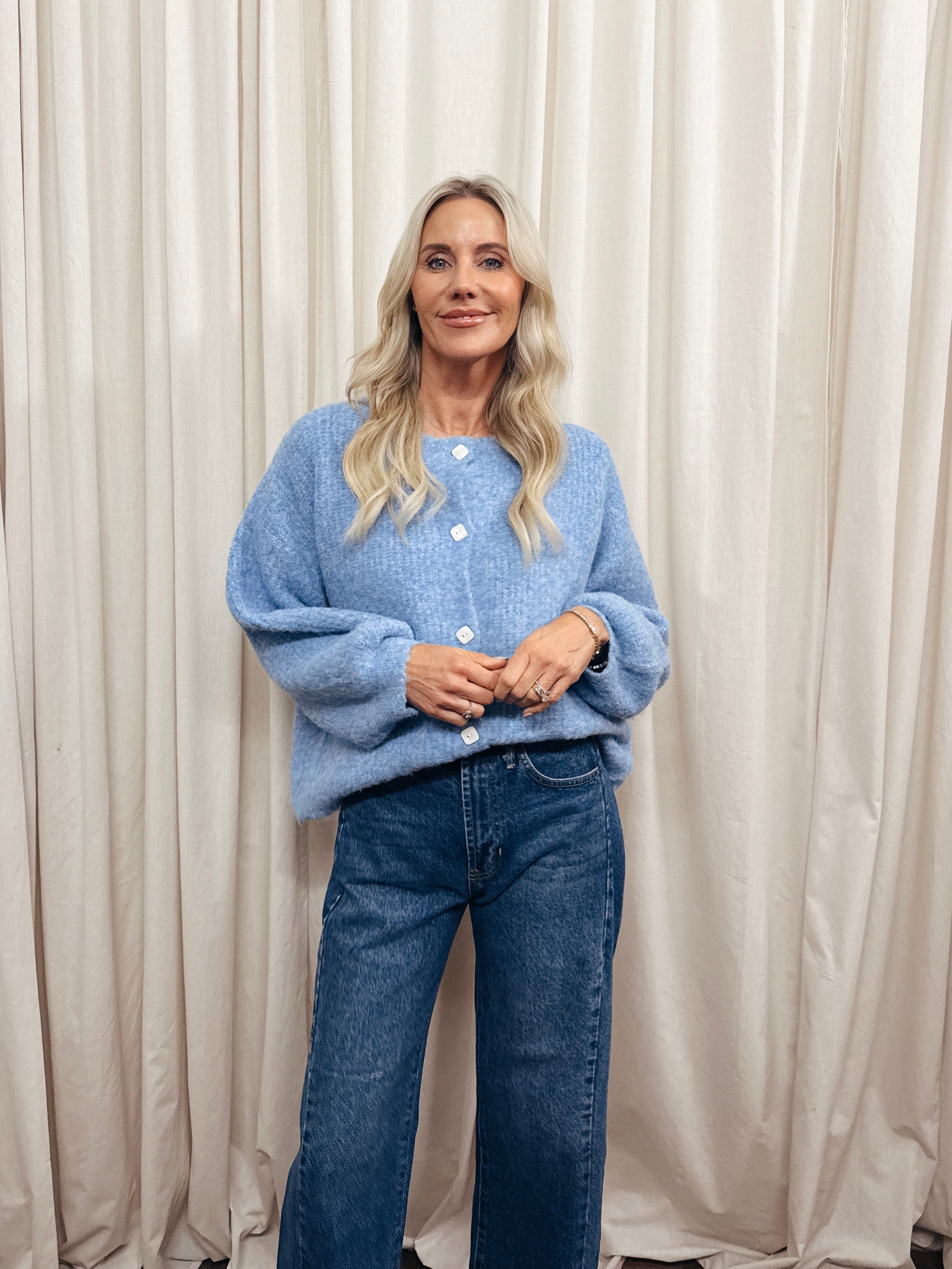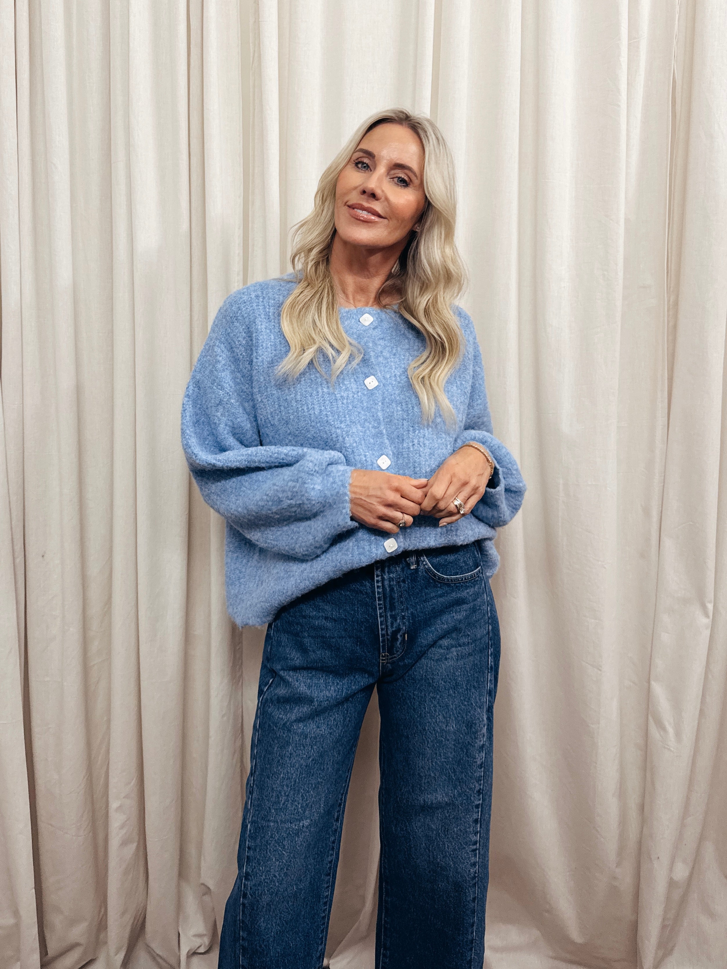 Crafted from a plush, textured knit, this oversized cozy cardigan features a ribbed round neckline and cuffs, exaggerated drop shoulders, a square button-up front, and balloon sleeves for an effortlessly relaxed silhouette. Complete with a regular-length fit, this chunky cardigan offers warmth with a modern edge.