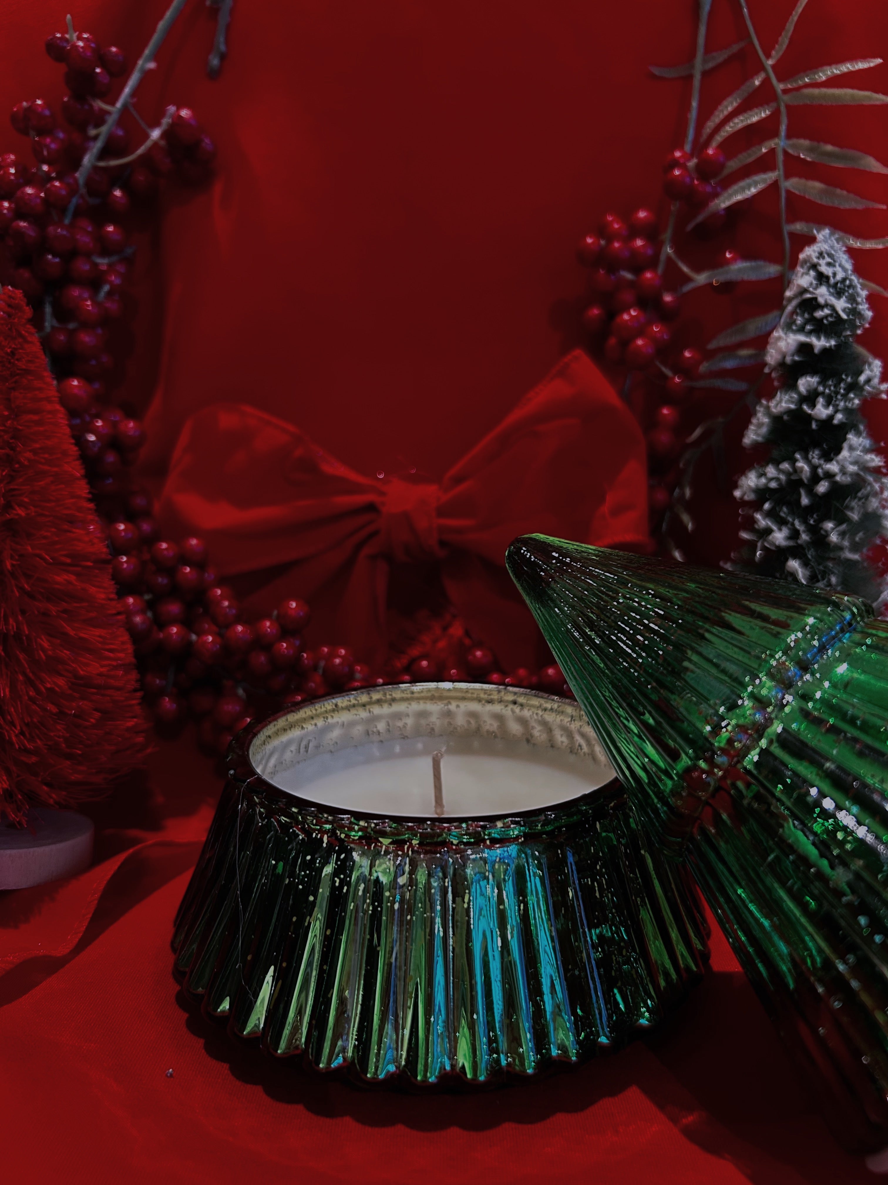 Glass Tree Green Glass Candle 9oz Fragrance notes: Fraser Fir, Juniper berry, warm vanilla Top: Fraser fir, crisp evergreen Heart: Juniper berry, bright green balsam Base: vanilla woods Mistletoe & Holly captures fresh Fraser fir and the bright juniper before settling into a soft vanilla woods embrace. Poured into a glossy glass tree, this 9oz candle is gift-ready and mantel-worthy styling with a scent story that reads like a holiday story. Perfect for host gifts, stocking-stuffers, and any corner that could use a little festive magic.