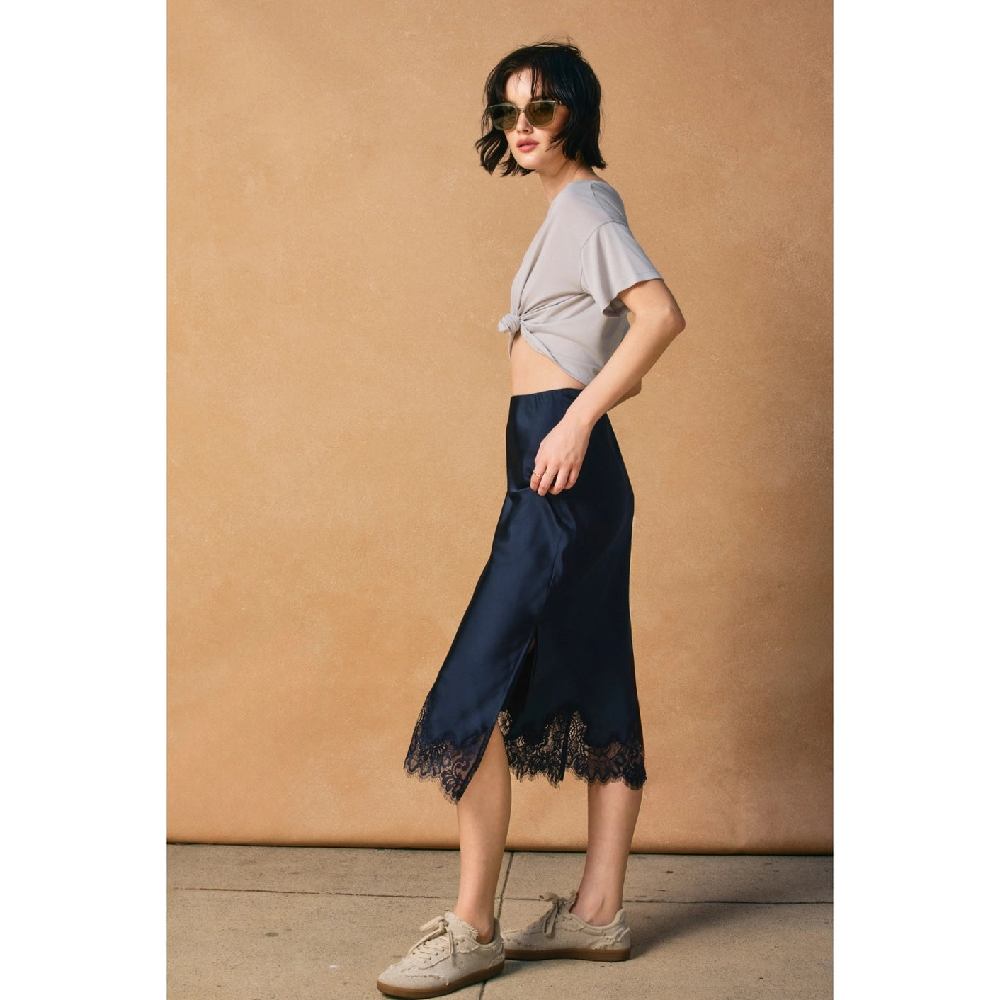 The Lace Trimmed Satin Midi Skirt